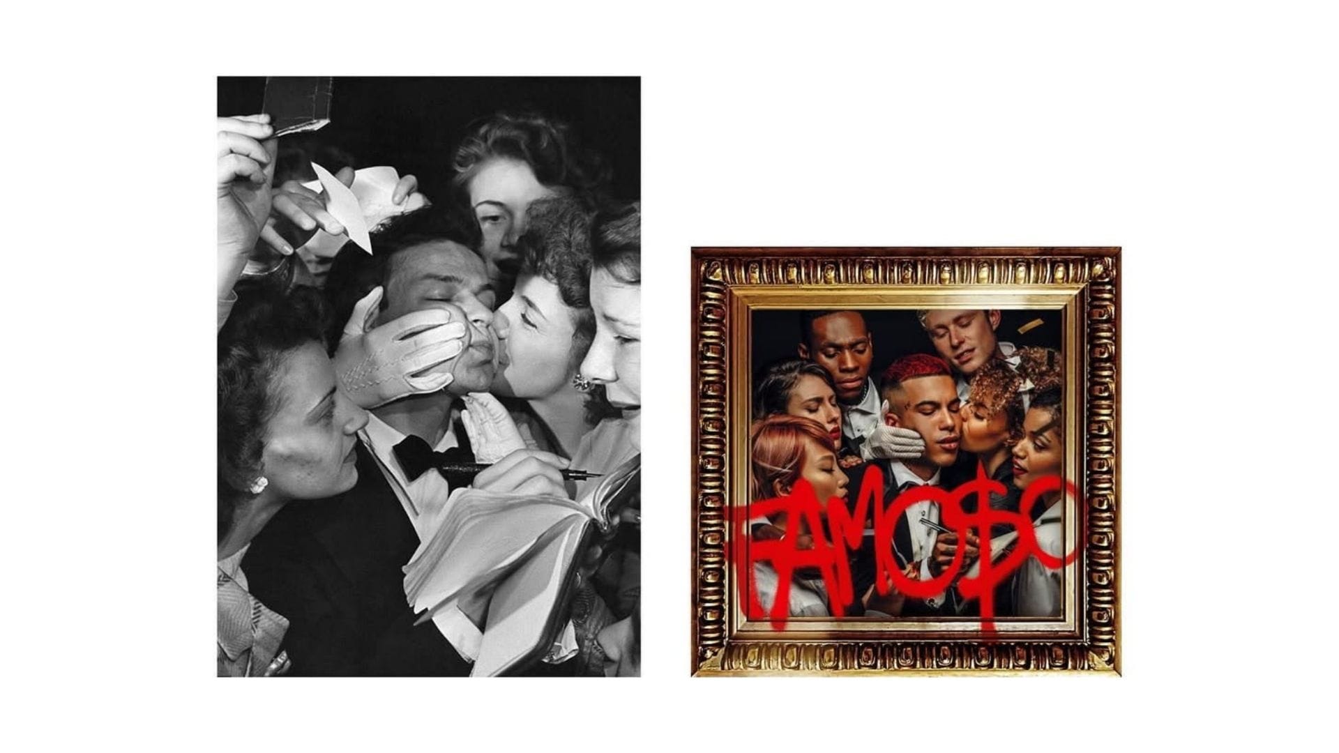 La copertina di Famoso si ispira a un iconico scatto di Frank Sinatra, circondato dalle fan tra baci, firme e attenzioni, diventato simbolo del concetto stesso di celebrità.